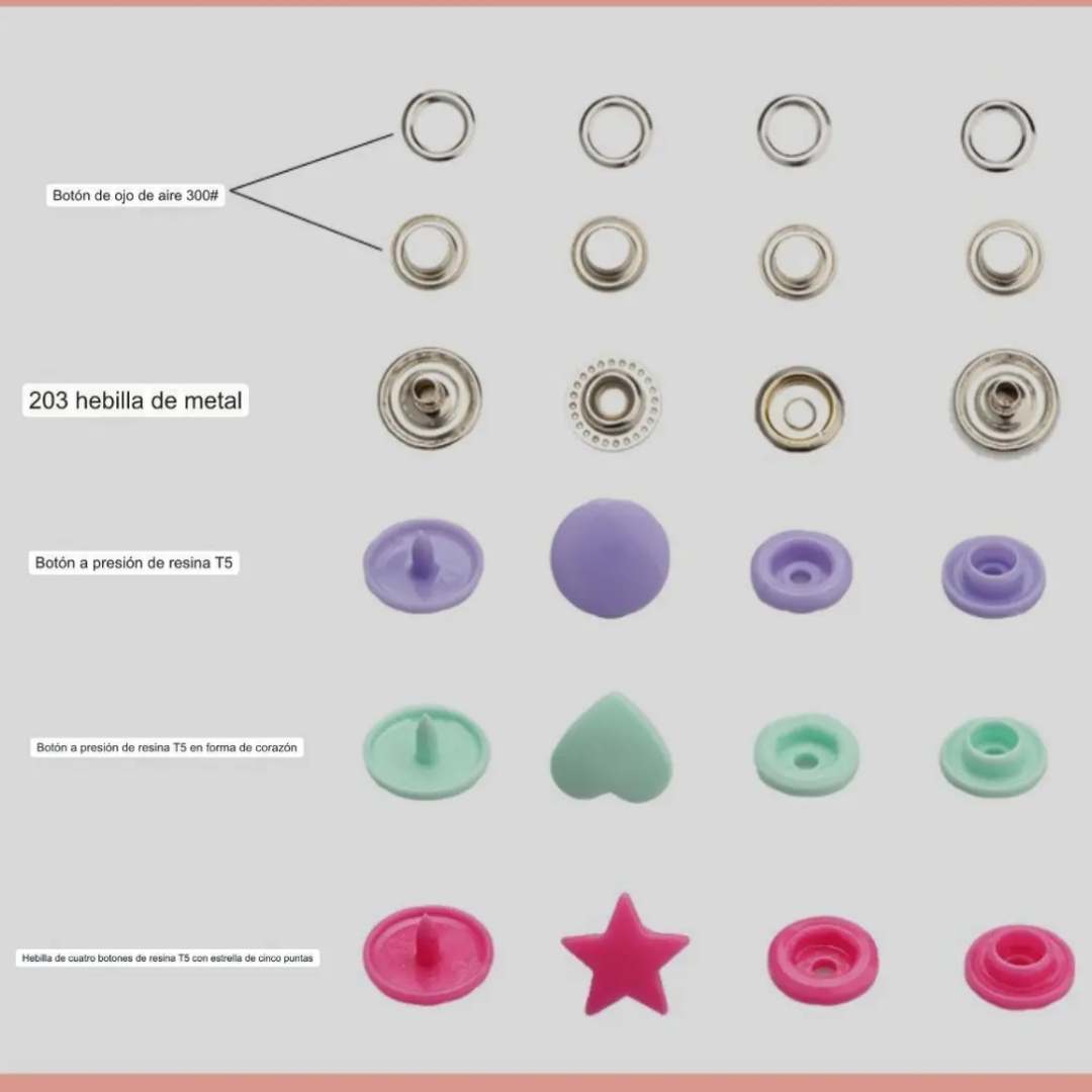 Variedad de Insumos: 250 juegos de snaps plásticos (25 colores vibrantes), 10 hebillas de latón y 40 ojetillos de cobre con sus arandelas.